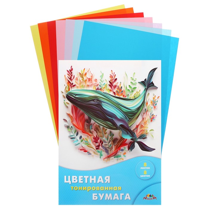 Бумага цветная А4, 8 листов "Кит", 8 цветов, тонированная, 80 г/м2, в папке