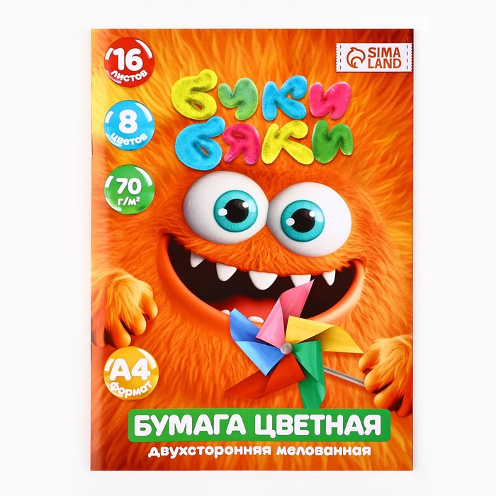 Бумага цветная А4 мелованная 16л 8 цв двусторонняя БукиБяки