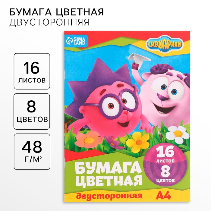 Бумага цветная, А4, 16 листов, 8 цветов, немелованная, двустороняя, на скрепке, 48 г/м², Смешарики