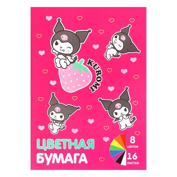 Бумага цветная А4, 16 листов 8 цветов Kuromi, немелованная газетная, односторонняя, на скрепке, 48 г/м²