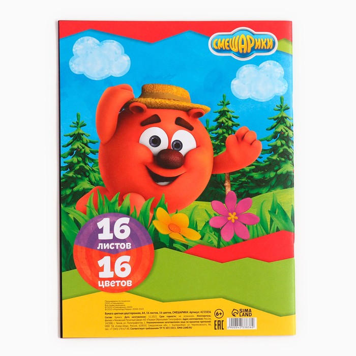 Бумага цветная, А4, 16 листов, 16 цветов, немелованная, двусторонняя, на скрепке, 48 г/м², Смешарики