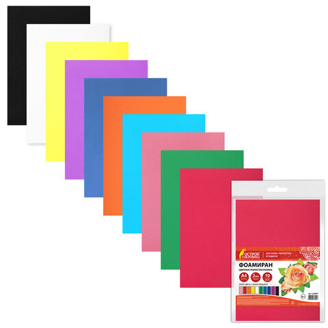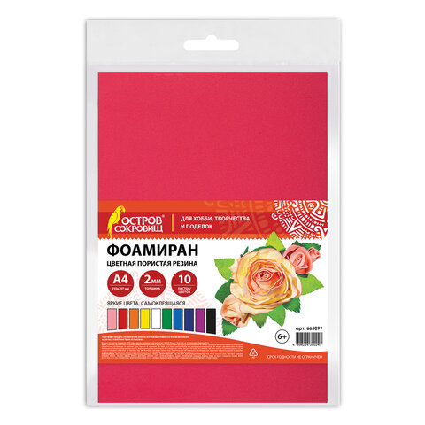 10 интенсивных цветов формата А4 на самоклеящейся основе позволят создать уникальную и эффектную поделку! Толщина каждого листа – 2 мм, размер листа – 29,7х21 см. Материал очень прост в использовании: легко режется обычными ножницами, ему можно придать любую форму, растягивая и скручивая. Самоклеящаяся основа позволяет использовать пористую резину без применения клея – качественный клеевой слой надёжно фиксирует фоамиран на различных поверхностях.