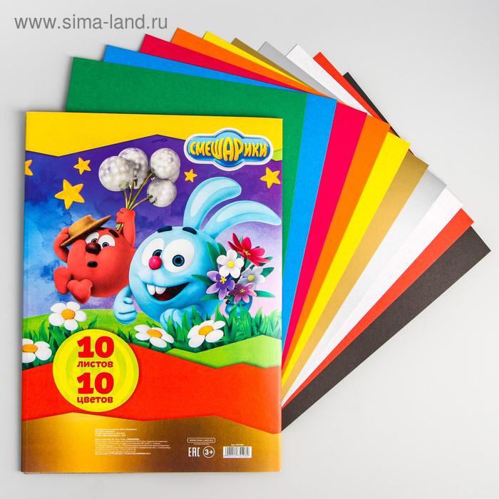 Картон цветной с блёстками, А4, 10 листов, 10 цветов, немелованный, двусторонний, в папке, 250 г/м², Смешарики