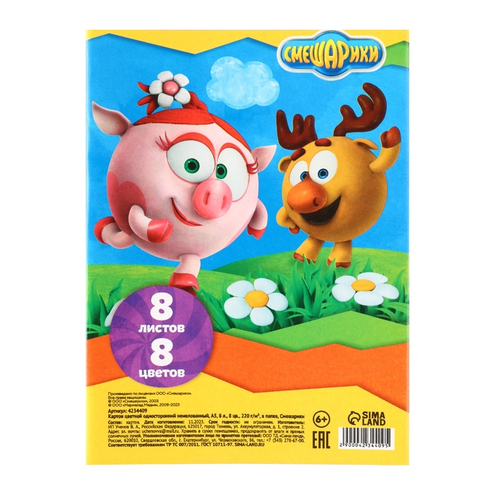 Картон цветной с блёстками, А4, 10 листов, 10 цветов, немелованный, двусторонний, в папке, 250 г/м², Смешарики