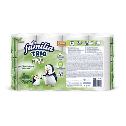 Белая трехслойная туалетная бумага Familia с экстрактом бамбука изготовлена из целлюлозы высшего качества.