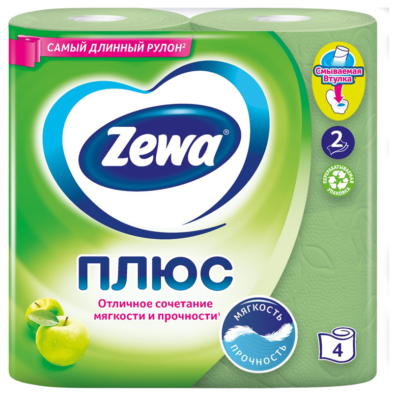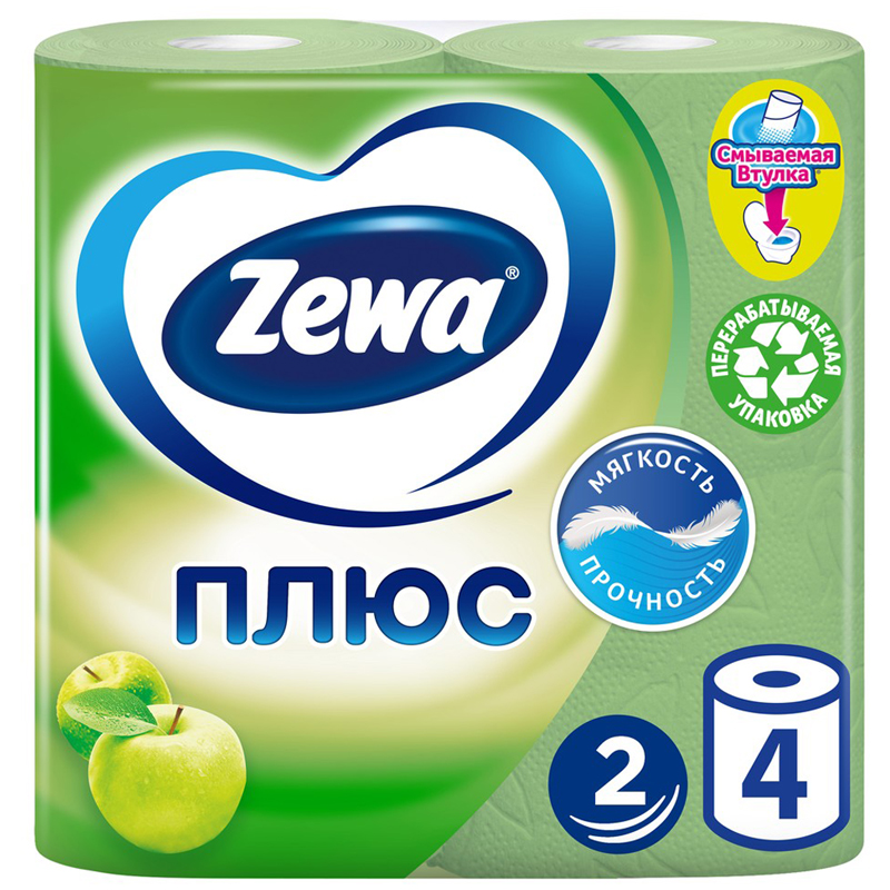 Туалетная Бумага Zewa 2-ух слойная с ароматом яблока - это отличное сочетание мягкости и прочности. .<br/>Она одобрена дерматологами и прекрасно подойдет всем членам вашей семьи – и тем, кому нужна мягкая бумага, и тем, кому важна прочность. <br/>Позаботьтесь о себе и своих близких вместе с Zewa.<br/><br/>Туалетная бумага Zewa Плюс имеет сертификат FSC™. Покупая товары Zewa со знаком FSC™ (FSC-C003255), вы поддерживаете ответственное использование лесов.<br/>