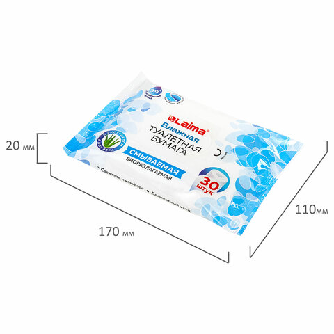 Влажную туалетную бумагу LAIMA можно безопасно смывать в унитаз, как и сухую туалетную бумагу*. Листы ультрамягкой белой туалетной бумаги пропитаны специальным лосьоном с экстрактом алоэ, который обеспечивает бережный и эффективный уход. Не содержит спирт, парабенов, красителей и силиконов. В упаковке 30 листов, которые легко извлекаются. Плотно закрывающийся клапан с клеевой основой предохраняет их от высыхания. Размер - 10х19 см.
