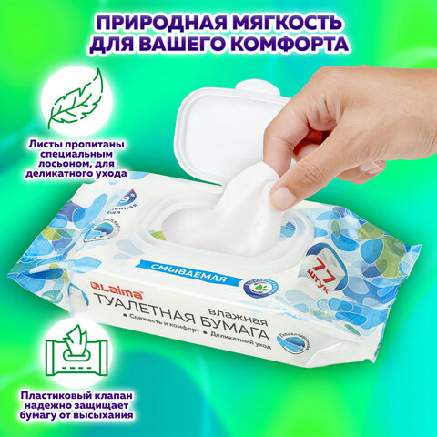 Влажную туалетную бумагу LAIMA можно безопасно смывать в унитаз, как и сухую туалетную бумагу, но не более двух штук одновременно. Листы ультрамягкой белой туалетной бумаги пропитаны специальным лосьоном, который обеспечивает бережный и эффективный уход. Не содержит спирт, парабенов, красителей и силиконов. В пачке 77 листов. Плотно закрывающийся пластиковый клапан надежно защищает бумагу от высыхания.