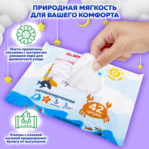 Не содержит спирта, парабенов, красителей и силиконов. В упаковке 42 листа, которые легко извлекаются. Плотно закрывающийся клапан с клеевой основой предохраняет бумагу от высыхания.