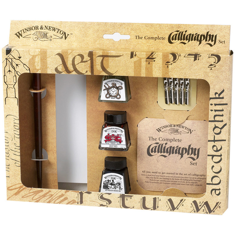 УЦЕНКА - Набор туши художественной Winsor&Newton для каллиграфии, 3шт., 14мл, черный, 5 наконечников для перьев, подставка, инструкция, стекл. флакон,