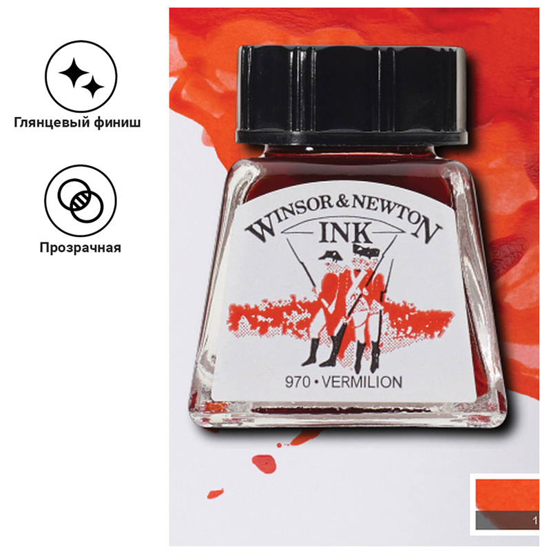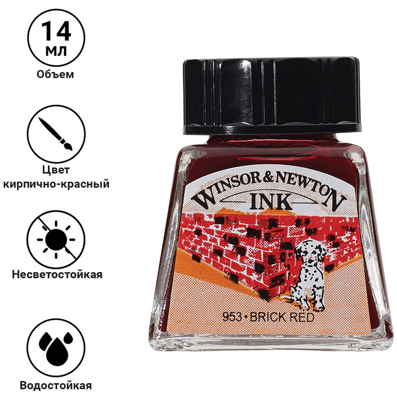 Цветную тушь для рисования Winsor&Newton используют иллюстраторы, дизайнеры и каллиграфы с 1890-х годов. <br/>26 ярких, прозрачных оттенков, изготовленных на основе жидких красителей в растворе шеллака, сообщающего красочному слою водостойкость и глянец. Все цвета смешиваются между собой, кроме серебра и золота. Тушь не рекомендуется смешивать с другими красками из-за различия связующего. Инструменты для работы: кисть, перо, аэрограф в процессе работы можно очищать водой. Загустевшую тушь можно разбавить спиртом. <br/>Может наноситься кистью, перьевой ручкой или аэрографом и широко используется дизайнерами, каллиграфами и художниками, а также иллюстраторами. <br/>• Цвет: кирпично-красный;<br/>• Объём: 14 мл.