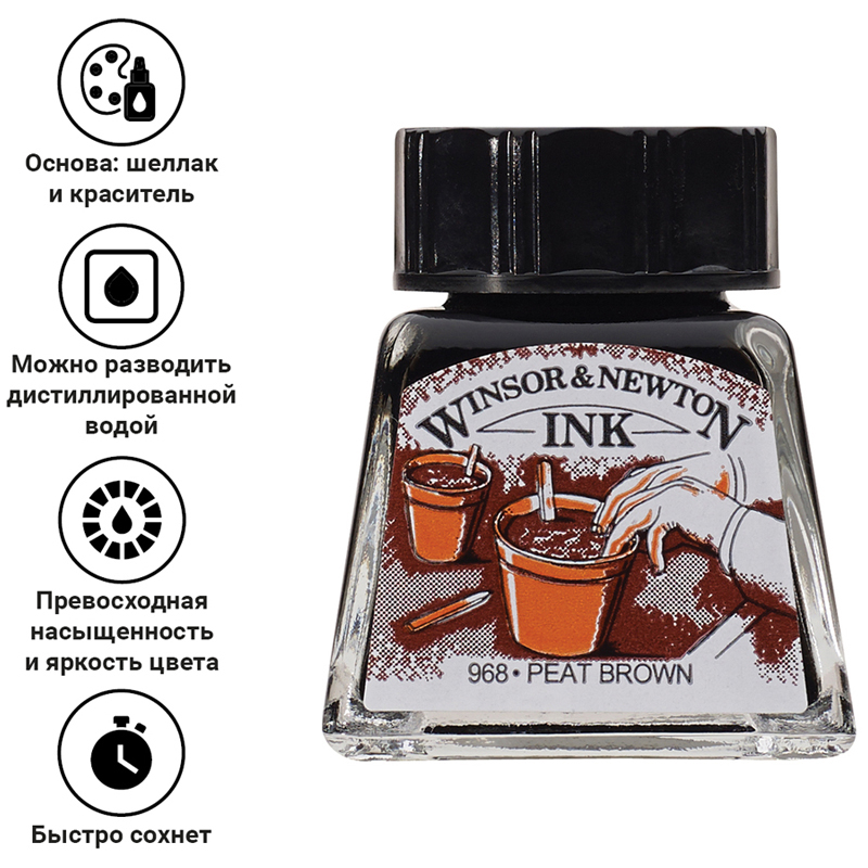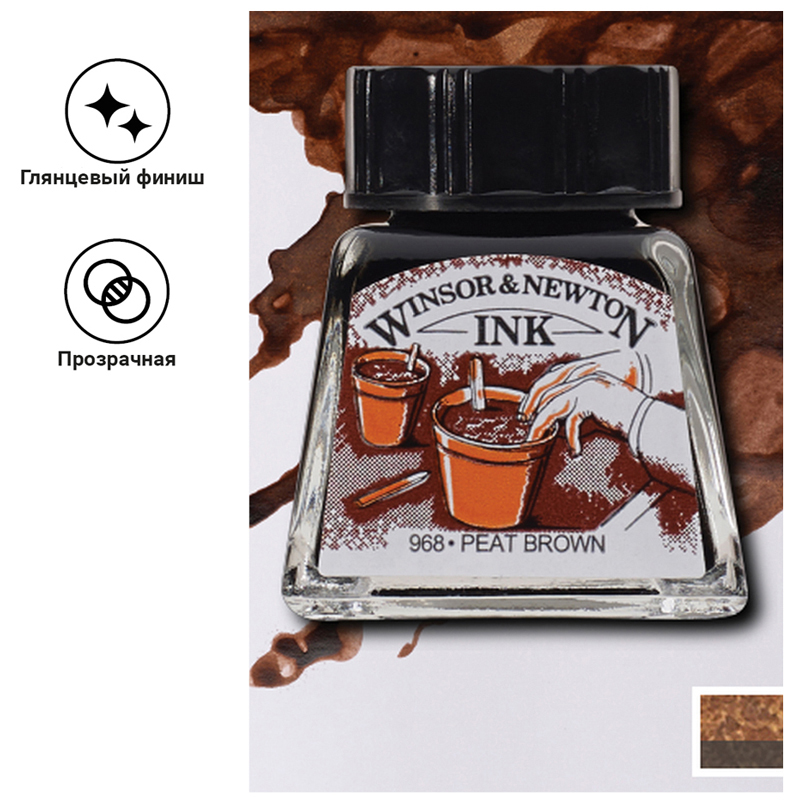 Цветную тушь для рисования Winsor&Newton используют иллюстраторы, дизайнеры и каллиграфы с 1890-х годов. <br/>26 ярких, прозрачных оттенков, изготовленных на основе жидких красителей в растворе шеллака, сообщающего красочному слою водостойкость и глянец. Все цвета смешиваются между собой, кроме серебра и золота. Тушь не рекомендуется смешивать с другими красками из-за различия связующего. Инструменты для работы: кисть, перо, аэрограф в процессе работы можно очищать водой. Загустевшую тушь можно разбавить спиртом. <br/>Может наноситься кистью, перьевой ручкой или аэрографом и широко используется дизайнерами, каллиграфами и художниками, а также иллюстраторами. <br/>• Цвет: торфяно-коричневый;<br/>• Объём: 14 мл.