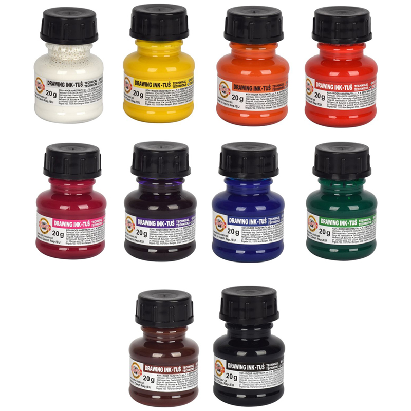 Тушь акриловая плакатная Koh-I-Noor, 20гр, 10цв., флакон в картон упак.