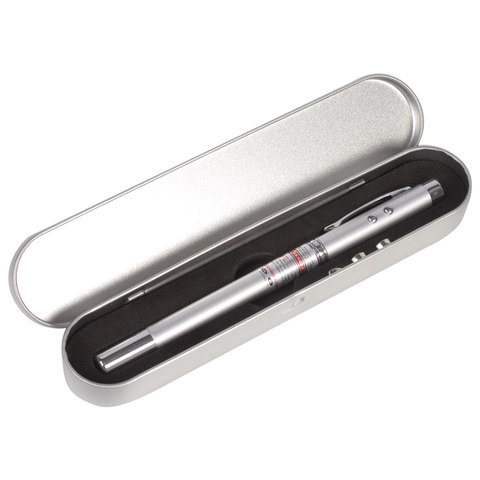 Лазерная указка 5 в 1: с точкой красного свечения, LED-фонарем, магнитом, телескопической указкой и шариковой ручкой. Является эффективным средством для привлечения внимания аудитории к информации, отображенной на доске или экране.