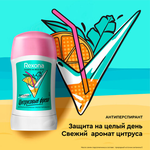 Сразу после приема душа воспользуйся любимым антиперспирантом в формате карандаш (стик) Rexona Цитрусовый заряд, чтобы продлить ощущение свежести и уверенности в защите от пота.