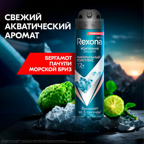 Улучшенная^^ формула Рексона Мен с минеральным комплексом высыхает за 3 секунды и оставляет приятное ощущение на коже. Без липкости, без следов. Антиперспирант Rexona Men разработан на основе формулы усиленной^^ эффективности: создает дышащий микробарьер для непревзойденной^^ защиты от пота и запаха на 72 часа. Технология Motionsense активируется при движении, сохраняя свежесть на весь день. Свежий цитрусовый аромат с акватическими нотами садится близко к телу и не перебивает аромат вашего парфюма.