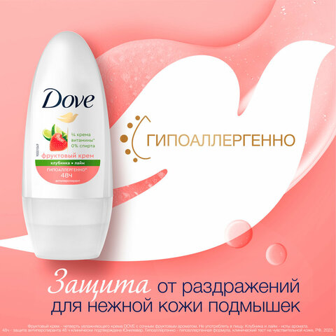 Гипоаллергенный* женский антиперспирант обеспечивает надежную защиту от пота и неприятных запахов до 48 часов**, при этом бережно заботится о нежной коже подмышек. Продукт содержит 1/4 крема с ароматом клубники и лайма, витамины Е и F^, бережно ухаживает, защищает от раздражений и способствует восстановлению кожи подмышек.