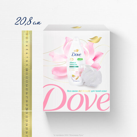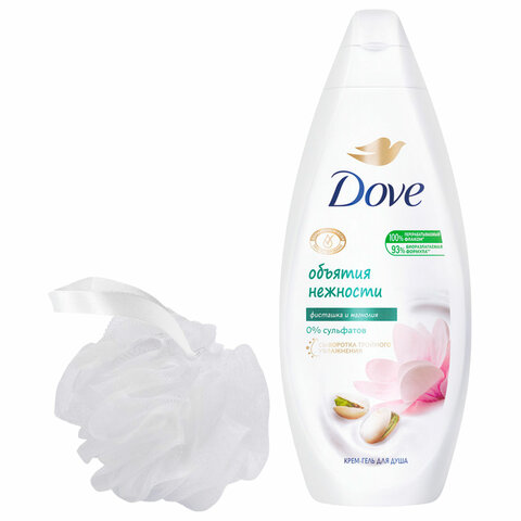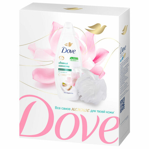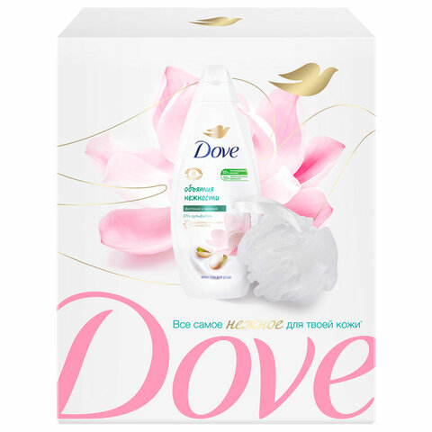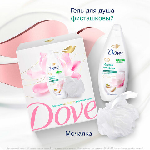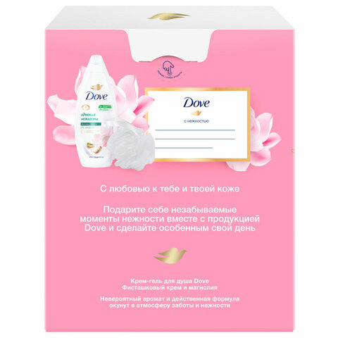 "Дарите нежность и заботу с подарочным набором Dove! В составе бессульфатный крем-гель для душа Фисташковый крем и магнолия и мочалка.