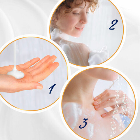 Нанесите на мочалку или руки. Вспеньте, распределите по коже. Смойте водой.
