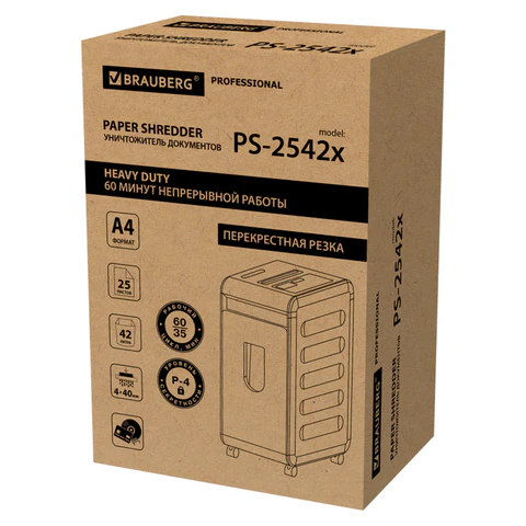 Уничтожитель документов (шредер) BRAUBERG PROFESSIONAL PS-2542x с улучшенным рабочим циклом предназначен для продолжительного уничтожения документов, компакт-дисков и пластиковых карт (банковских, дисконтных и прочих), потерявших актуальность.