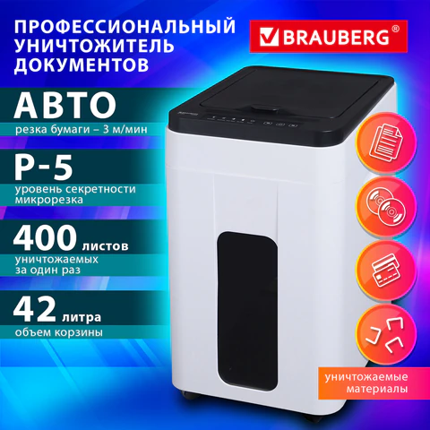 Основным преимуществом BRAUBERG PROFESSIONAL AUTO PS-300m является удобная функция автоподачи. Положите в лоток пачку бумажных документов (до 400 листов А4) и продолжайте заниматься своим рабочим функционалом, не отвлекаясь на уничтожение документов. Кроме того, в ручном режиме можно уничтожить до 8 листов бумаги. Шредер отличается высокой продолжительностью непрерывной работы – до 60 минут в режиме автоподачи.