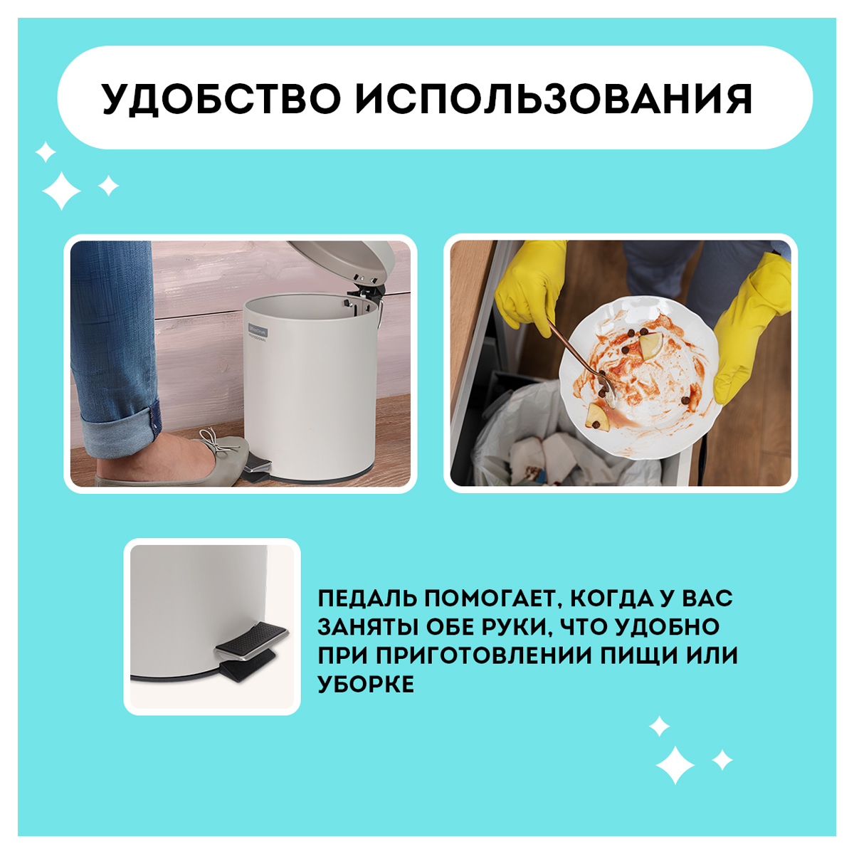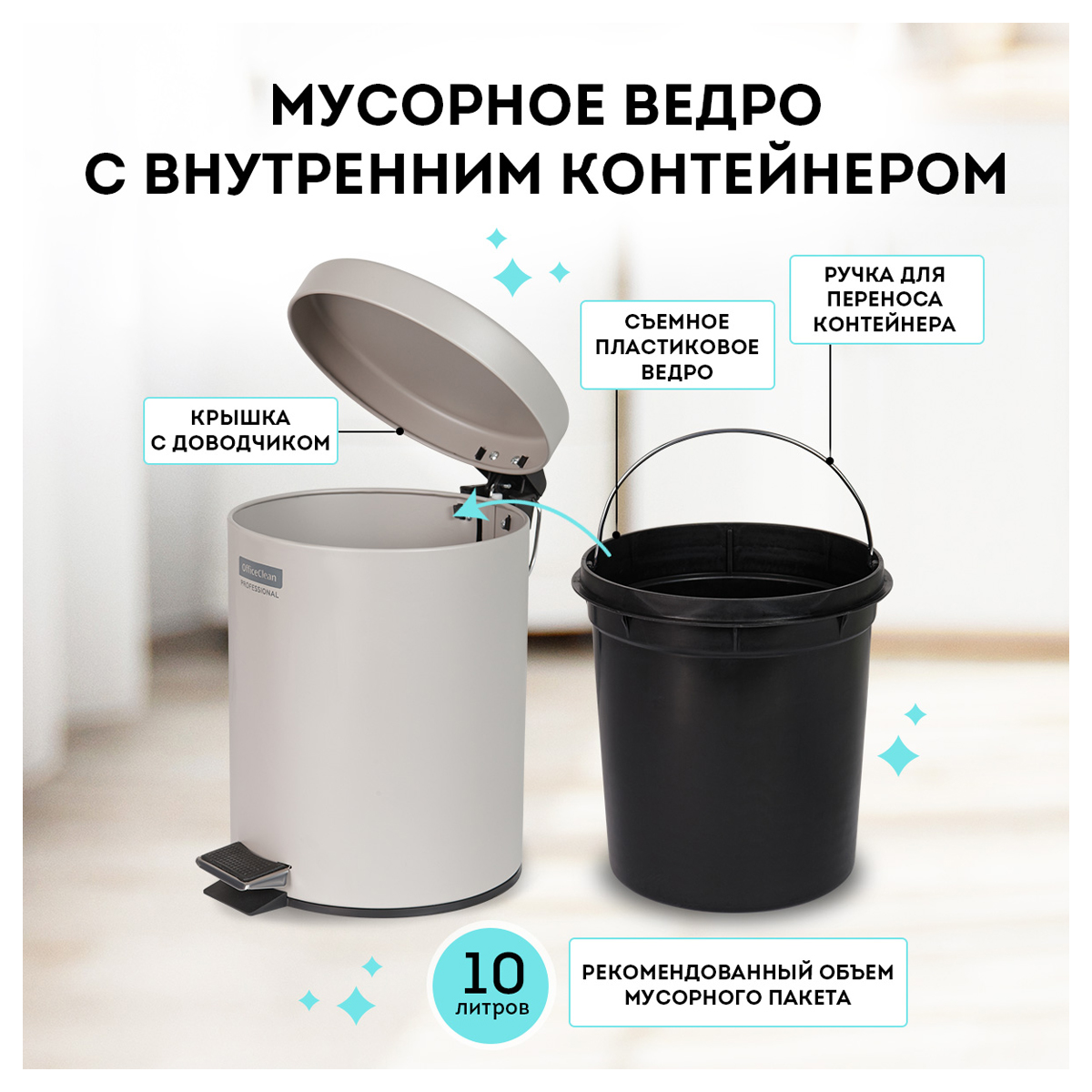 Предназначен для сбора бытового мусора. Оснащен педалью с плавным нажатием, плавным доводчиком для закрытия крышки. Внутреннее съёмное пластиковое ведро имеет удобную рукоятку для извлечения. Отвечает всем требованиям гигиены. Рекомендуемый объем мешка 10л.