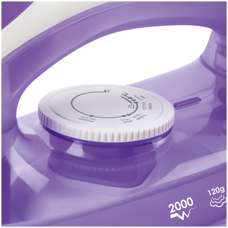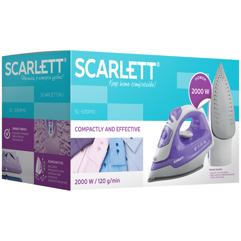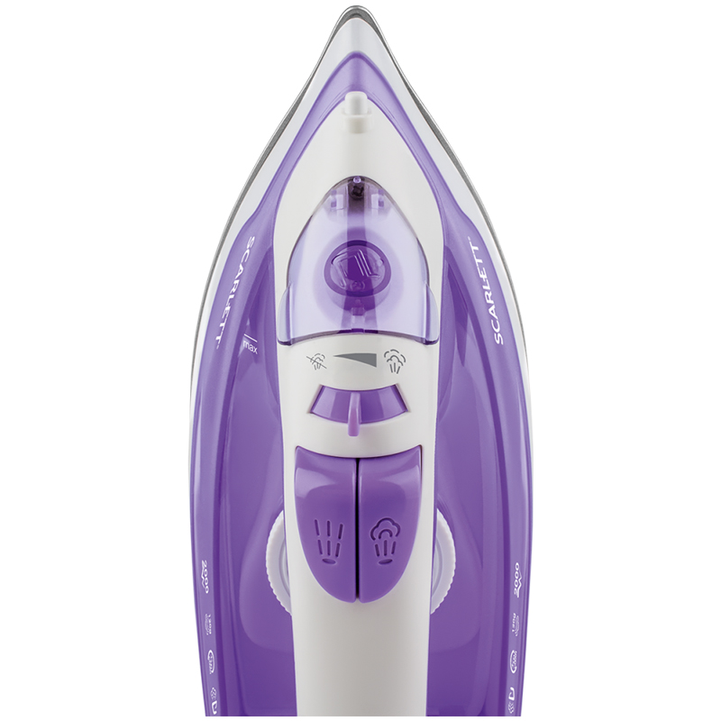 Утюг Scarlett SC-SI30P10 с пластиковым корпусом бело-фиолетового цвета снабжен идеально гладкой подошвой с полимерным антипригарным покрытием SimplePro. Прибор с мощностью 2000 Вт легко скользит по поверхности любой ткани и может эффективно отпаривать вещи, выдавая 40 граммов пара в минуту в режиме глажения с паром. В режиме парового удара этот компактный электроприбор для дома создает 120 гр. пара в течение минуты, расправляя даже самые непослушные складки. Благодаря функции вертикального отпаривания утюг Scarlett SC-SI30P10 может применяться для обработки паром вещей, развешанных на плечиках или вешалке. Под подошвой прибора образуется паровая воздушная подушка, которая обеспечивает дополнительную защиту поверхности ткани. Резервуар для воды вмещает 180 мл. Для его заправки можно использовать прозрачный мерный стакан, включенный в комплект прибора.
