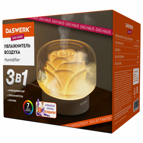 "Увлажнитель воздуха DASWERK соединяет в себе несколько устройств: увлажнитель, аромадиффузор и ночник. Принцип его работы основан на ультразвуковом воздействии, которое превращает воду в мелкодисперсный туман. Благодаря подсветке создается эффект пламени. Подсветка имеет 7 цветов, которые можно менять, нажав на кнопку на корпусе. При добавлении эфирного масла в воду, можно создать благоприятную и уютную атмосферу в доме. В комплекте уже есть ароматическое масло с запахом лаванды.