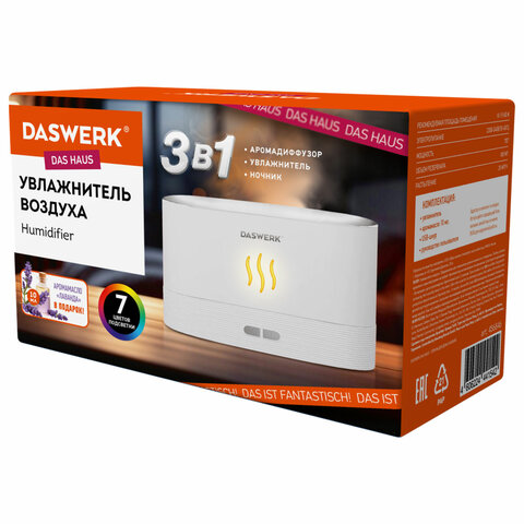 "Увлажнитель воздуха DASWERK соединяет в себе несколько устройств: увлажнитель, аромадиффузор и ночник. Принцип его работы основан на ультразвуковом воздействии, которое превращает воду в мелкодисперсный туман. Благодаря подсветке создается эффект пламени. Подсветка имеет 7 цветов, которые можно менять, нажав на кнопку на корпусе. При добавлении эфирного масла в воду, можно создать благоприятную и уютную атмосферу в доме. В комплекте уже есть ароматическое масло с запахом лаванды.