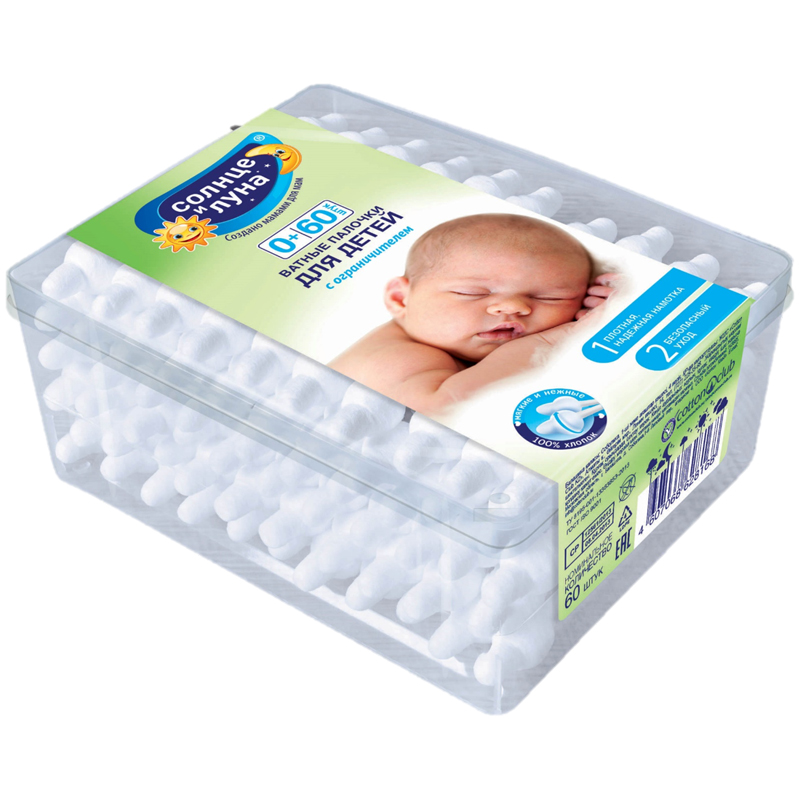 Ватные палочки детские 60 шт., с ограничителем, СОЛНЦЕ И ЛУНА, 100% хлопок, ш/к 28168, 14152