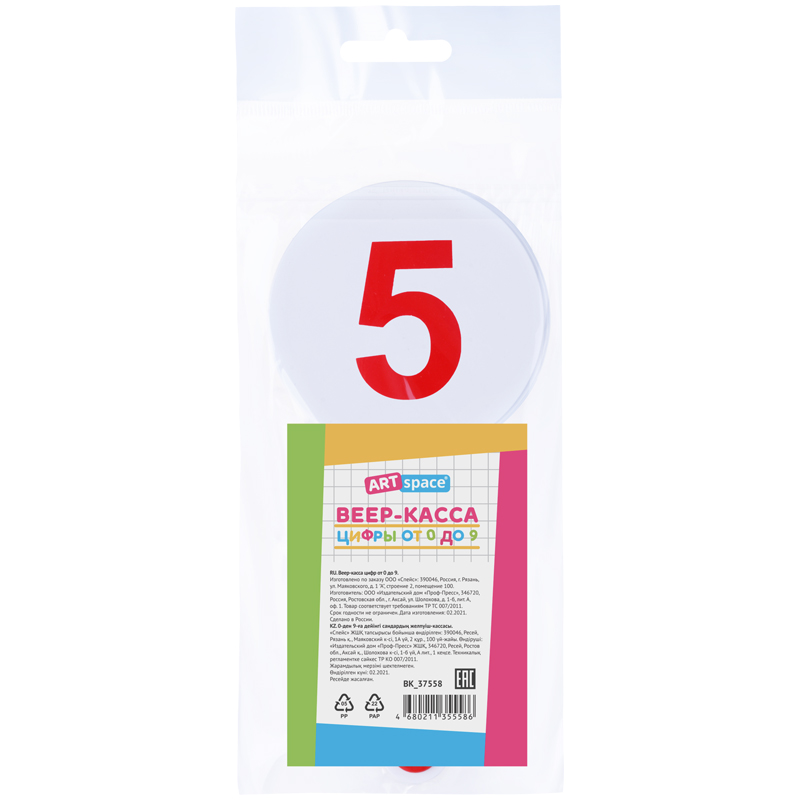 Веер-касса цифр от 0 до 9 ArtSpace предназначена для обучения и развития детей дошкольного и младшего школьного возраста. <br/>Состоит из 5 элементов с нанесенными с двух сторон цифрами. Поставляется в пакете с европодвесом.