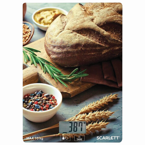 Весы кухонные SCARLETT SC-KS57P65 "Хлеб", электронный дисплей, max вес 10 кг, тарокомпенсация, стекло