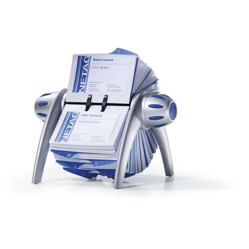 Важные контакты всегда на виду: VISIFIX® - профессиональное решение для структурированного хранения визитных карточек. Вращающаяся визитница изготовлена из пластика премиального качества. Быстрый и удобный поиск нужного контакта. 200 двусторонних карманов формата 104x72мм на 400 визиток. Легкое извлечение и фиксация карманов. Комплектуется разделителем A-Z. Размер: 215х120х185мм.