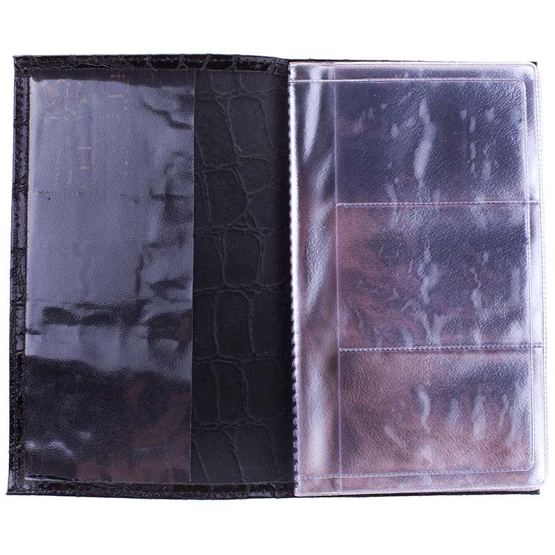 Визитница<br/>Материал - кожа<br/>Материал клапана - ПВХ<br/>Материал внутреннего блока - ПВХ<br/>Тип скрепления - вложенный блок<br/>Цвет - черный<br/>Упаковка - пакет с европодвесом<br/>Противокражная защита - да