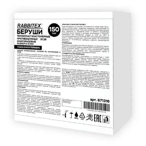 Беруши одноразовые пенополиуретановые со шнурком, 1 пара в пакете, SNR 43 дБ, RABBITEX, 671313