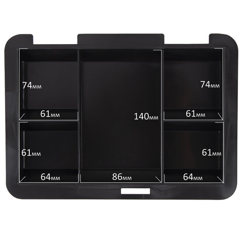 Съемный лоток из ударопрочного пластика с 3 отделениями. Подходит для денег, карточек, ключей, печатей. Под лотком есть пространство, где можно хранить документы и бумаги.