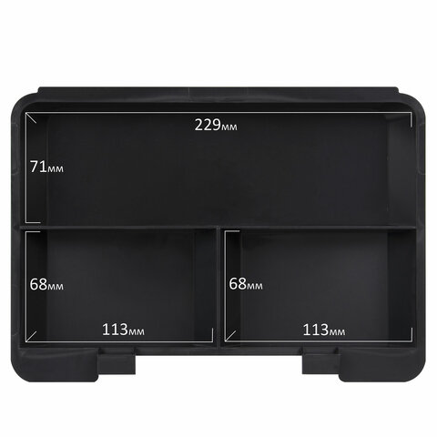 Съемный лоток из ударопрочного пластика с 3 отделениями. Подходит для денег, карточек, ключей, печатей. Под лотком есть пространство, где можно хранить документы и бумаги.