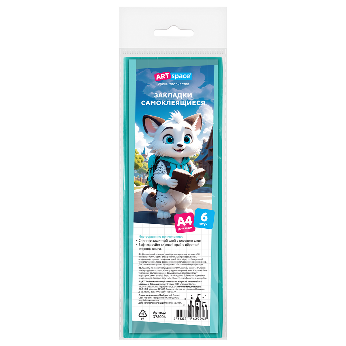 Закладки самоклеящиеся для книг формата А4 (ляссе с клеевым краем), ПВХ, 6 штук, ArtSpace, бирюза