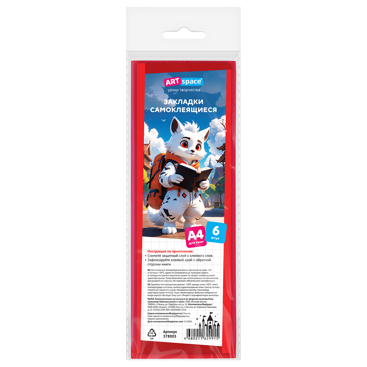 Закладки самоклеящиеся для книг формата А4 (ляссе с клеевым краем), ПВХ, 6 штук, ArtSpace, карминово-красный