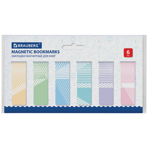 Закладки для книг МАГНИТНЫЕ, "PASTEL", набор 6 штук, 60x20 мм, BRAUBERG, 117013
