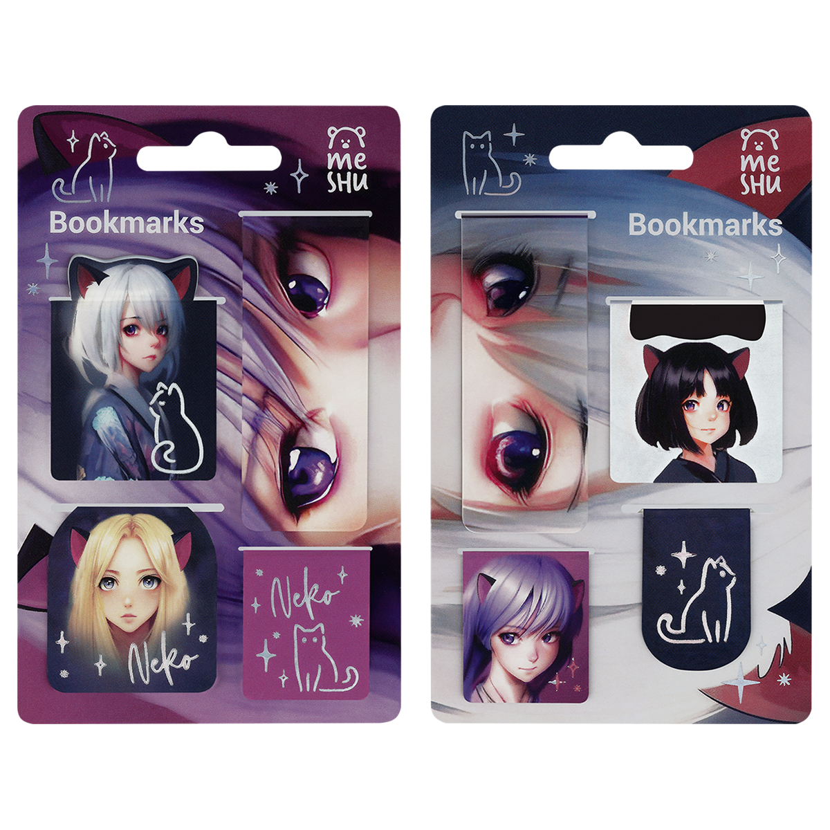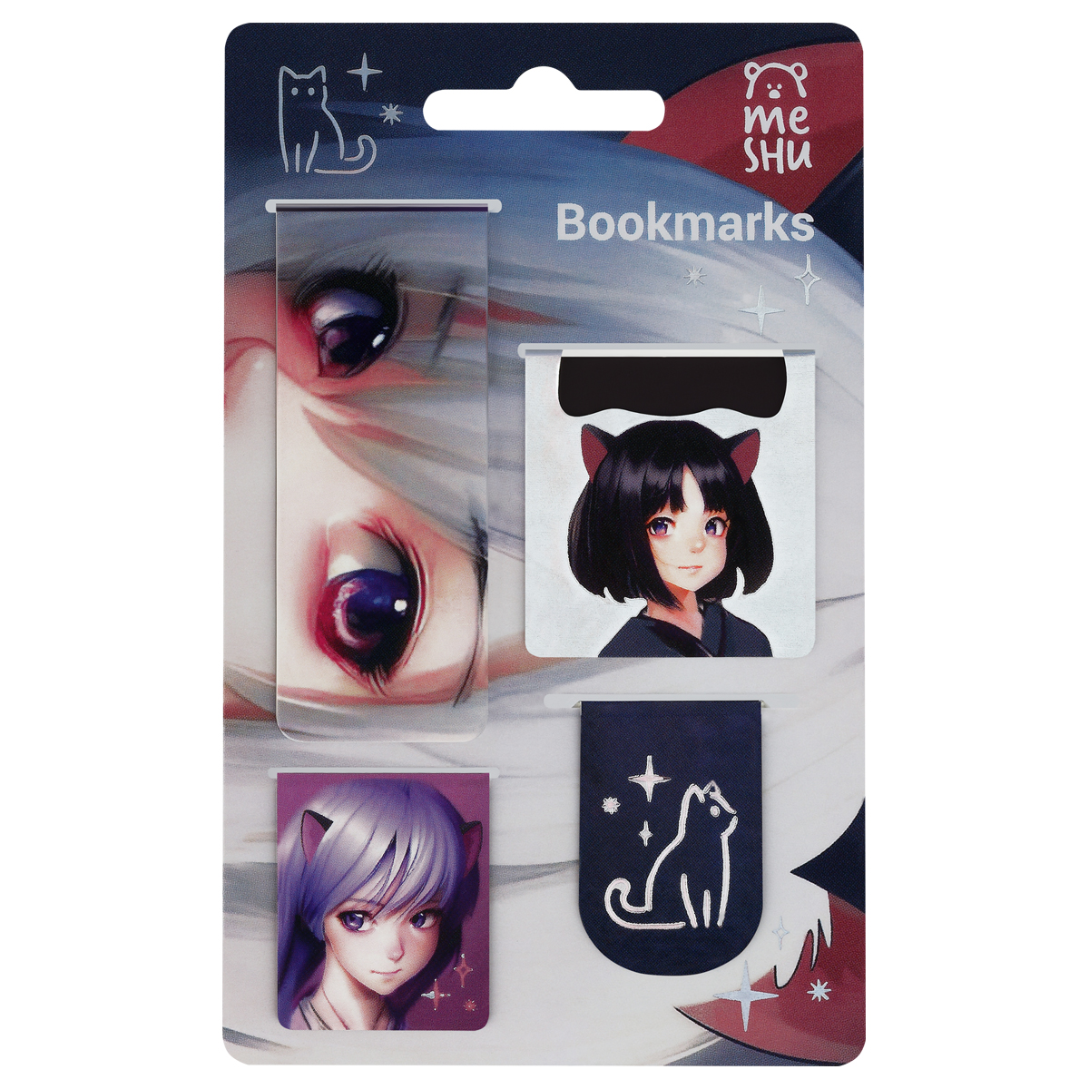 Магнитные закладки MESHU "Neko" помогают запомнить и быстро найти нужную страницу. В набор входят четыре аксессуара разных форм и размеров. Они надёжно крепятся к бумажным страницам и не выпадают из книги. Иллюстрации в стиле аниме дополнены фольгированными элементами. Аксессуары сделаны из винила и плотного картона. Набор размещён на подложке с европодвесом и упакован в пакет.