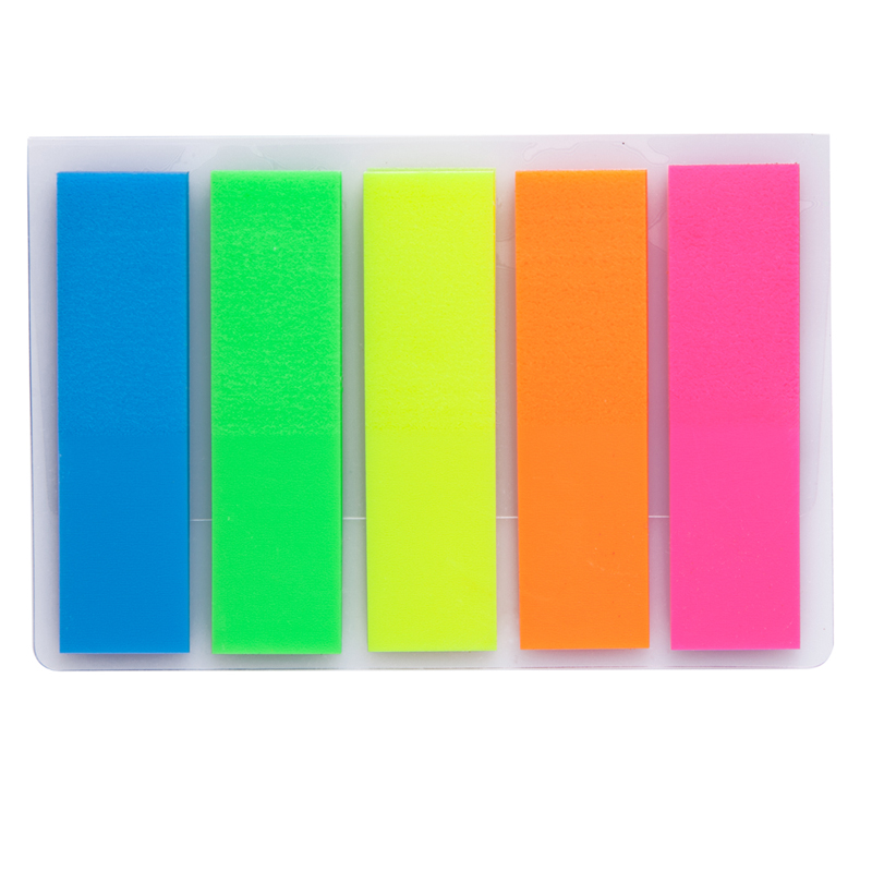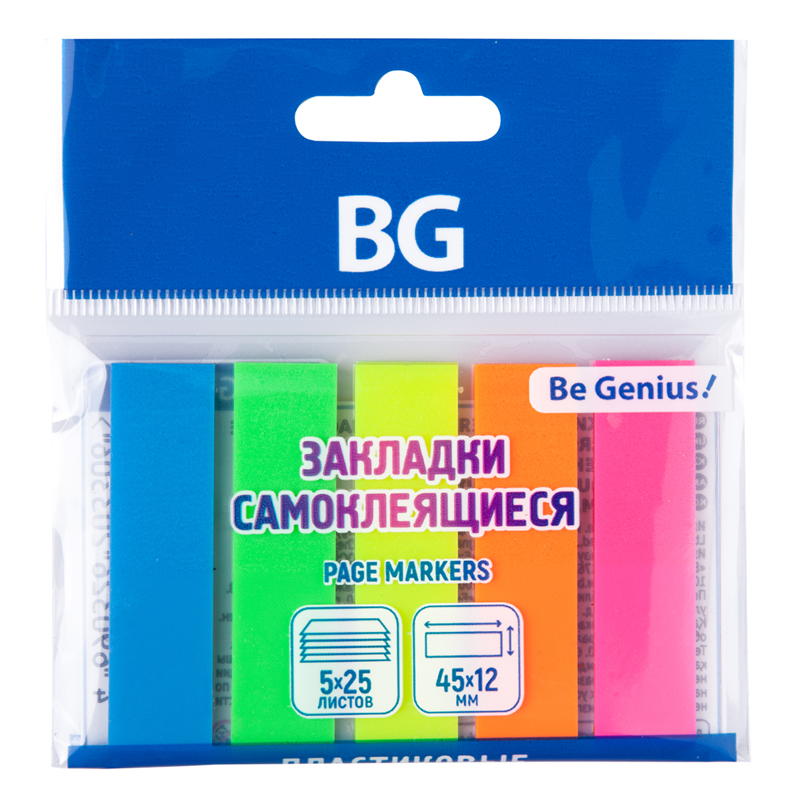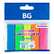 Самоклеящиеся флажки-закладки BG «Неон» для записей с клеевым краем отлично подойдут для сохранения важной информации. Размер стикеров для заметок – 45*12 мм. В упаковке 5 блоков пластиковых закладок-флажков по 25 листов. Количество стикеров - 125. 5 ярких неоновых цветов: синий, оранжевый, зелёный, розовый, жёлтый. Закладки могут служить пометками в документах, использоваться для записи краткой информации, для выделения текста. Прозрачный пластик, из которого изготовлены закладки, не скрывает при этом самого текста. Закладки клейкие легко удаляются, не оставляя следов и не повреждая бумагу. Клейкость: акриловая эмульсия на водной основе 32 Н/м.<br/>• Количество листов: 125;<br/>• Цвет блока: цветной;<br/>• Склейка: есть.