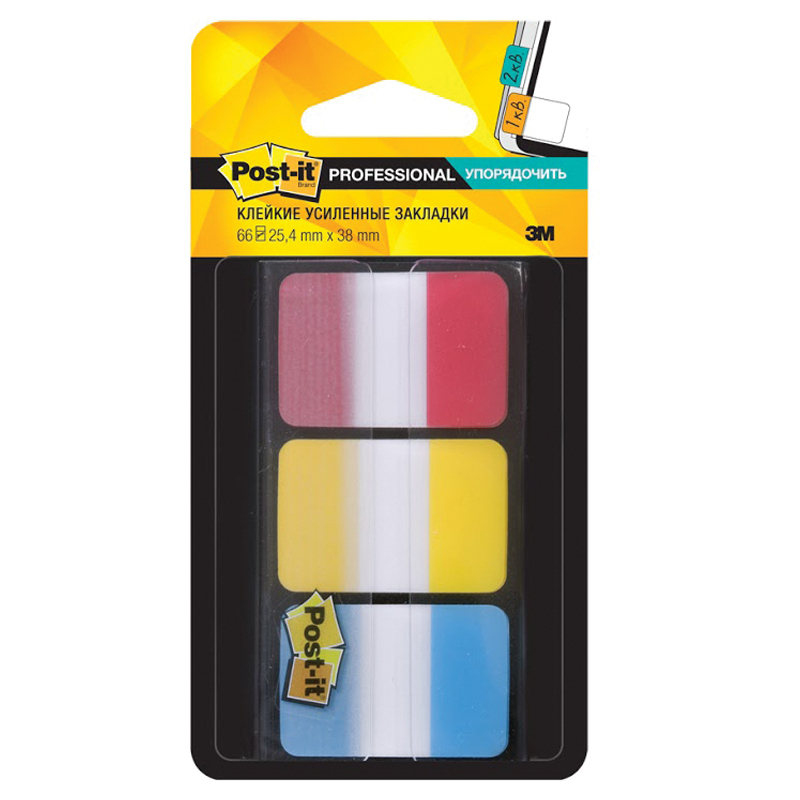 Клейкие закладки Post-it Professional помогут выделить и отметить нужную информацию, организовать цветное кодирование страниц и разделов, пластиковых папок и файлов. Уникальная клеевая система Post-it с максимальной клейкостью (50 Н/м)- закладки отлично держатся на любых поверхностях и предметах, при отклеивании не оставляют следов клея, допускают многократное переклеивание. Основа из прочного полиэстера увеличенной толщины (114 мкм) - устойчива к изгибам и истиранию: закладки долго сохраняют форму и цвет. Скругленные углы и специальная обработка кромки исключают повреждение оказавшихся рядом файлов и документов, а также случайные травмы у пользователей. Специальное покрытие на поверхности закладок обеспечивает возможность надписей любыми пишущими принадлежностями Набор: 3 цвета. Формат ширина 25 мм. Закладки шириной 25 мм уложены по Z-принципу в компактном диспенсере: извлекаются одной рукой и строго по одной. Цвета: красный, желтый, синий, по 22 закладки каждого цвета. Особых условий хранения не требует, сертификации не подлежит, срок годности не ограничен.