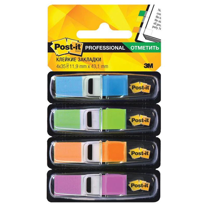 Клейкие закладки Post-it Professional помогут выделить и отметить нужную информацию, организовать цветное кодирование страниц и разделов. Уникальная клеевая система Post-it с оптимальной для документов клейкостью (33 Н/м) - закладки отлично держатся бумаге любого типа, при отклеивании не оставляют следов клея, допускают многократное переклеивание. Основа из прочного и износостойкого полиэстера со специальным покрытием толщиной 63 мкм - закладки долго сохраняют форму и цвет. На поверхности закладки можно делать надпись любыми пишущими принадлежностями. Набор: 4 неон. цвета. Формат ширина 12 мм. , в упаковке 4 контейнера по 35 закладок. Особых условий хранения не требует, сертификации не подлежит, срок годности не ограничен.