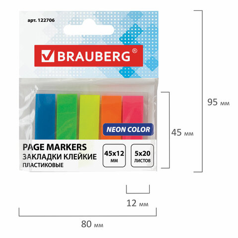 Набор пластиковых закладок 5 неоновых цветов размером 45х12 мм состоит из 100 листов, по 20 закладок каждого цвета. Клейкий слой - 22 Н/м. Легко клеятся к любой поверхности и не оставляют следов. Материал закладок позволяет делать надписи ручкой и карандашом. Уложены на пластиковом основании. Поставляются в полиэтиленовом пакете с европодвесом.