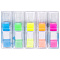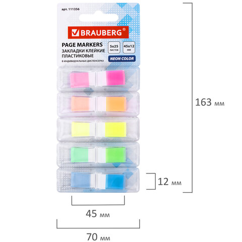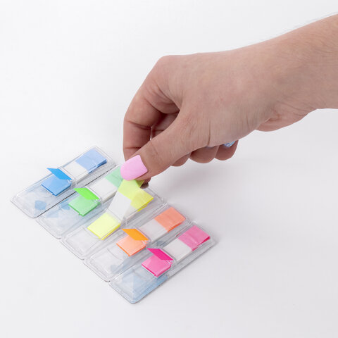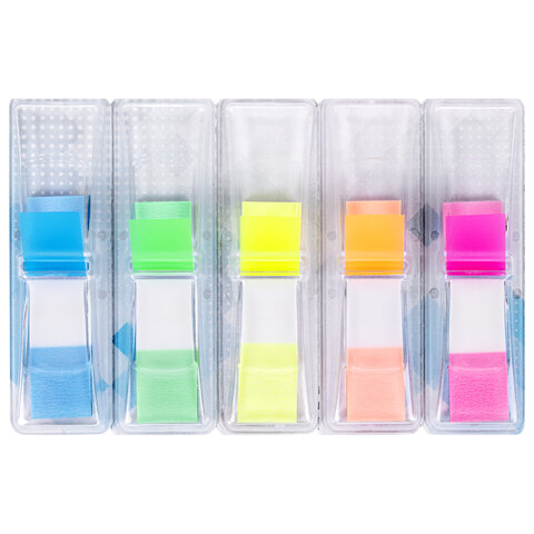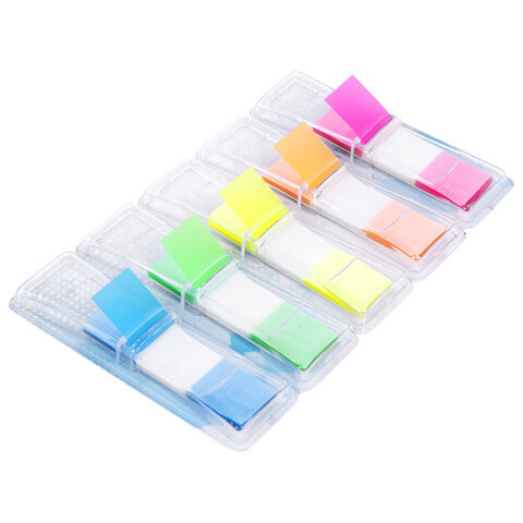 Набор пластиковых закладок 5 неоновых цветов размером 45х12 мм состоит из 125 листов, по 25 закладок каждого цвета. Клейкий слой - 22 Н/м. Легко клеятся к любой поверхности и не оставляют следов. Материал закладок позволяет делать надписи ручкой и карандашом. Каждый цвет уложен в индивидуальном пластиковом отрывном диспенсере. Поставляются в блистере с европодвесом.