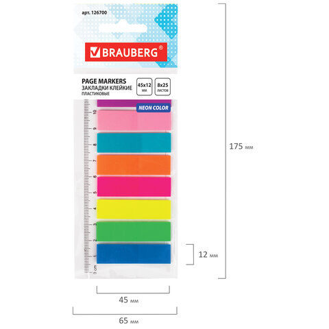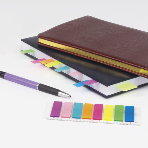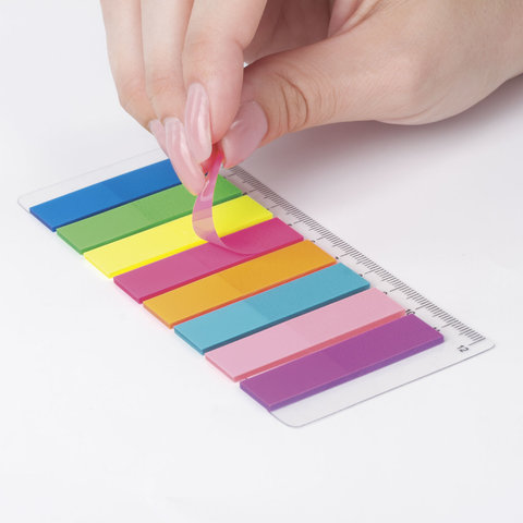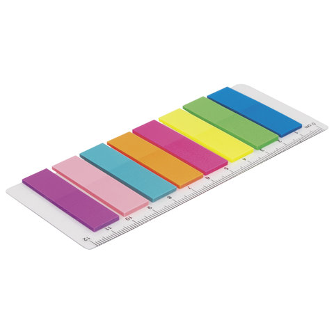 Набор пластиковых закладок 8 неоновых цветов размером 45х12 мм состоит из 200 листов, по 25 закладок каждого цвета. Клейкий слой - 22 Н/м. Легко клеятся к любой поверхности и не оставляют следов. Материал закладок позволяет делать надписи ручкой и карандашом. Уложены на пластиковой линейке длиной 12 см. Поставляются в полиэтиленовом пакете с европодвесом.