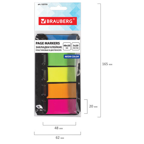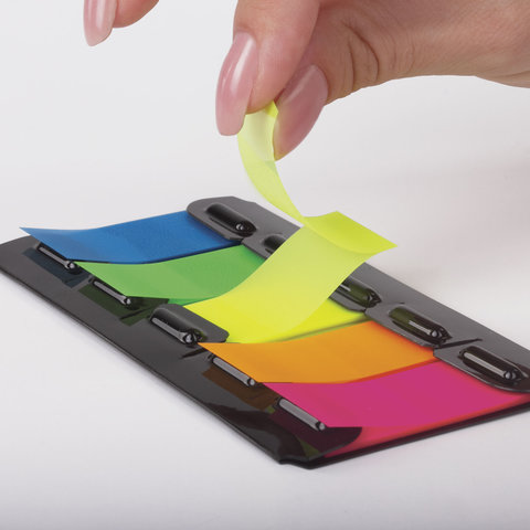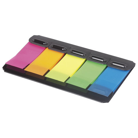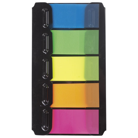 Набор пластиковых закладок 5 неоновых цветов размером 48х20 мм состоит из 100 листов, по 20 закладок каждого цвета. Клейкий слой - 22 Н/м. Легко клеятся к любой поверхности и не оставляют следов. Материал закладок позволяет делать надписи ручкой и карандашом. Уложены в диспенсере. Поставляются в полиэтиленовом пакете с европодвесом.