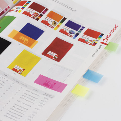 Яркие пластиковые полупрозрачные закладки BRAUBERG акцентируют внимание на важных страницах книги, журнала, каталога и др.