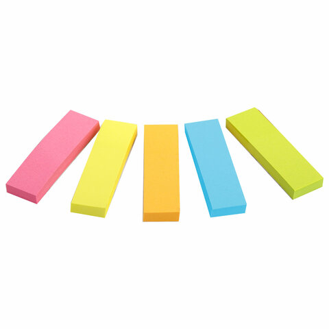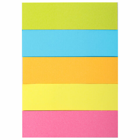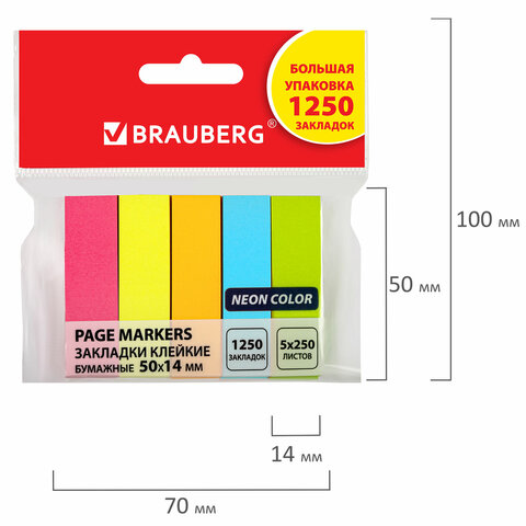 Комплект содержит 5 наборов бумажных закладок по 5 неоновых цветов размером 50х14 мм, состоит из 1250 листов, по 250 закладок каждого цвета. Клейкий слой - 22 Н/м. Легко клеятся к любой поверхности и не оставляют следов. Материал закладок позволяет делать надписи ручкой и карандашом. Поставляются в полиэтиленовом пакете с европодвесом.